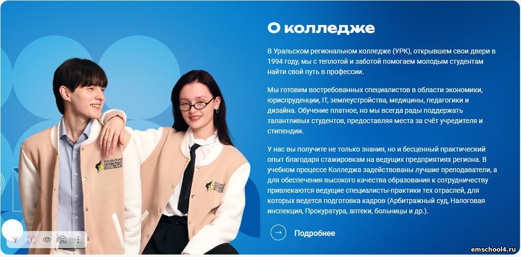Уральский региональный колледж (УРК), открыл свои двери в 1994 году. Готовит востребованных специалистов в области экономики, юриспруденции, IT, землеустройства, медицины, педагогики и дизайна. Обучение платное. День открытых дверей
