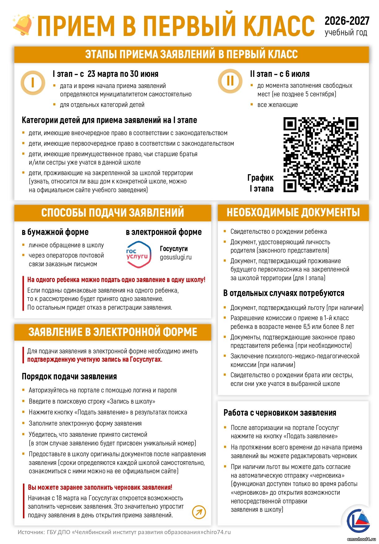Обращаем внимание, первый этап приемной кампании в 1 класс 2026/2027 учебного года начинается в 8-00 часов 1 апреля 2026 года, окончание 17-00 часов 30 июня 2026 г .